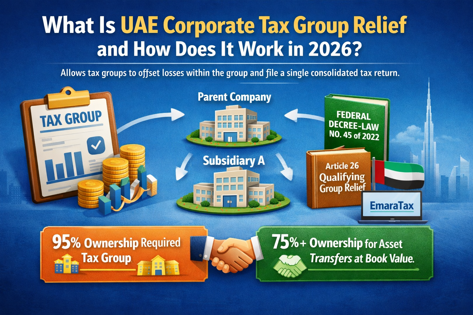 Quick Answer: UAE Corporate Tax Group Relief allows related companies to be treated as a single taxable entity under a Tax Group, enabling automatic loss offset across all group members. The parent must own at least 95% of the shares and voting rights of each subsidiary. Governed by Articles 40 to 43 of Federal Decree-Law No. 47 of 2022, Tax Groups register via EmaraTax and file one consolidated corporate tax return. Separately, Qualifying Group Relief under Article 26 allows related companies with 75% or more common ownership to transfer assets at book value without triggering a taxable gain.