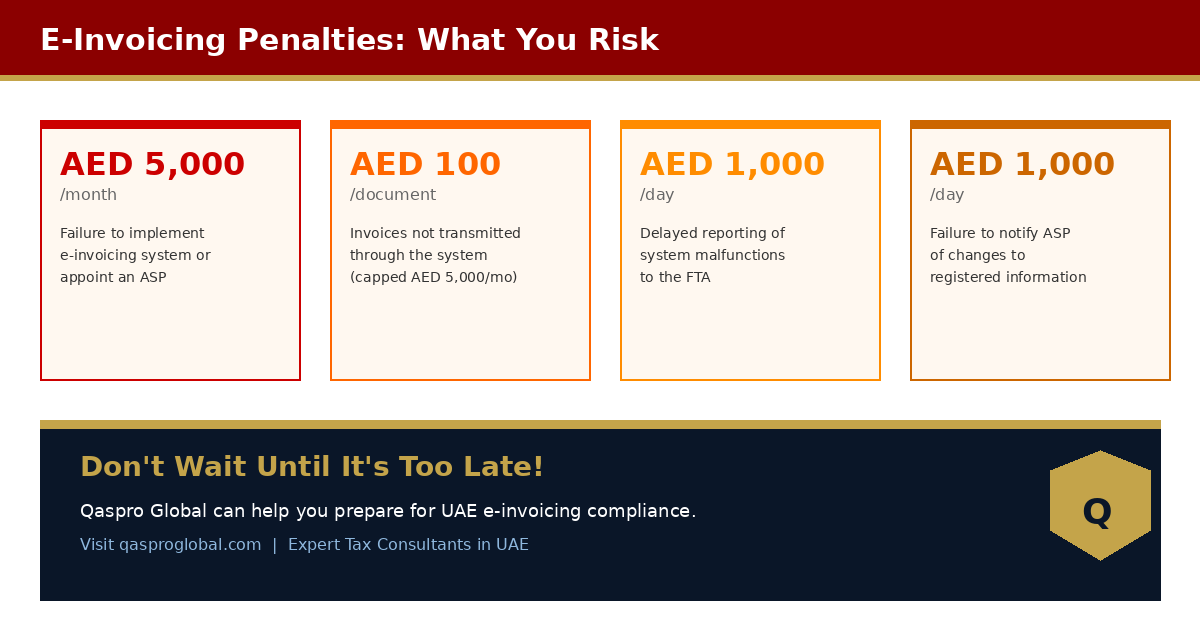 - Late VAT registration — AED 10,000 penalty for missing the 30-day deadline